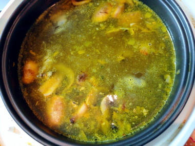Вливаем бульон и готовим до окончания режима. Затем переводим мультиварку на режим Суп, один час.