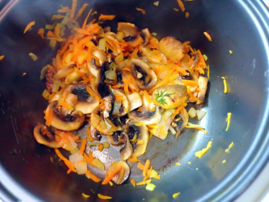Затем кладем шампиньоны, сливочное масло, перемешиваем, крышку закрываем и готовим еще десять минут.