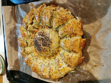 Отзыв 1: Насколько всё тщательно и аккуратно в этом рецепте! Вам нравится? Мне очень! Да, на скорую руку, из готового теста, но как красиво! Просто пирог-солнышко!! Хорошее чувство цвета, нежно и в то же время ярко. Простая, но такая эффектная формовка пирога. Такие рецепты всегда вызывают живой интерес и желание повторить, взять идею в свой арсенал.