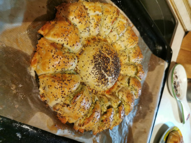 Просто и вкусно 🔥и очень красиво 👍 Искала рецепт, что сделать с остатками адыгейского сыра. У меня было примерно 450гр адыгейского сыра, добавила гр 50 обычного российского сыра на терке (вместо сулгуни в рецепте, чтобы связать адыгейский, боялась, что будет крошиться), добавила много укропа мелконарезанного, немного сухих итальянских трав, немного посолила, совсем чуть чуть. Сверху смазала яйцом и посыпала семенами Чиа. В духовке 30 мин при 180, и такой красавчик🌸Спасибо за рецепт: понятно, просто и вкусно, и быстро. Муж утром проснулся, и такой сюрприз к завтраку 🥐Да, тесто слоёное недрожжевое из магазина. 🥪ВСЕМ СОВЕТУЮ!