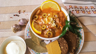 Прекрасный рецепт солянки нашла на сайте. По этому рецепту совсем несложно готовить, дольше его читать. Единственное отступление – томатную пасту я немного присыпала сахаром, боюсь, что будет кисло. Практически никогда не солю, нам и так достаточно соли в многочисленных ингредиентах. Сытный, наваристый, с ароматом копченостей, кислинкой лимона, остринкой чеснока и пикантными оливками. И всё это великолепие нивелируется ложечкой жирной сметаны и кусочком черного хлеба, намазанного тоненьким слоем только что приготовленной огненной горчицы. Мой муж ещё любит солянку с чёрными сухариками.