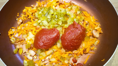 Помешивая, готовьте на сильном огне около 10-20 минут. Чтобы зажарка не пригорела, зачерпните половником бульон из кастрюли и добавьте в сковороду. Огонь сделайте умеренным и тушите томатную заправку до готовности всех компонентов.