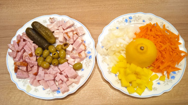Лук нашинкуйте мелко, морковку нарежьте от руки тонкими полосками или натрите на крупной тёрке. Маринованные огурцы измельчите по желанию кубиками, брусочками, либо натрите на тёрке.