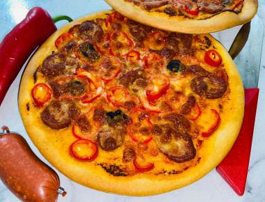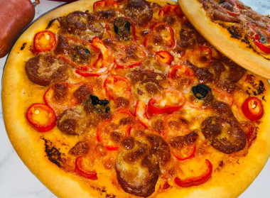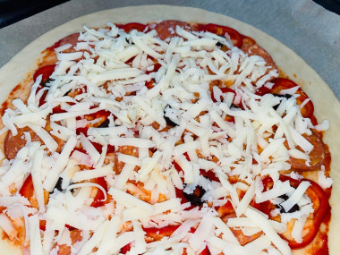 Выложите на тесто начинку из колбасы, помидоров, болгарского перца и маслин. Сверху посыпьте пиццу тертым сыром. Верните пиццу в духовку и выпекайте при 180°С еще примерно на 10 минут. Приятного аппетита!