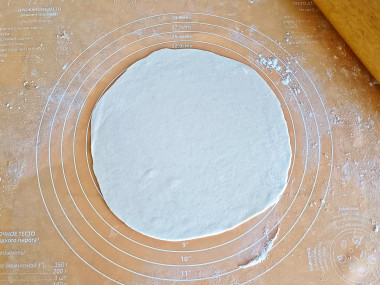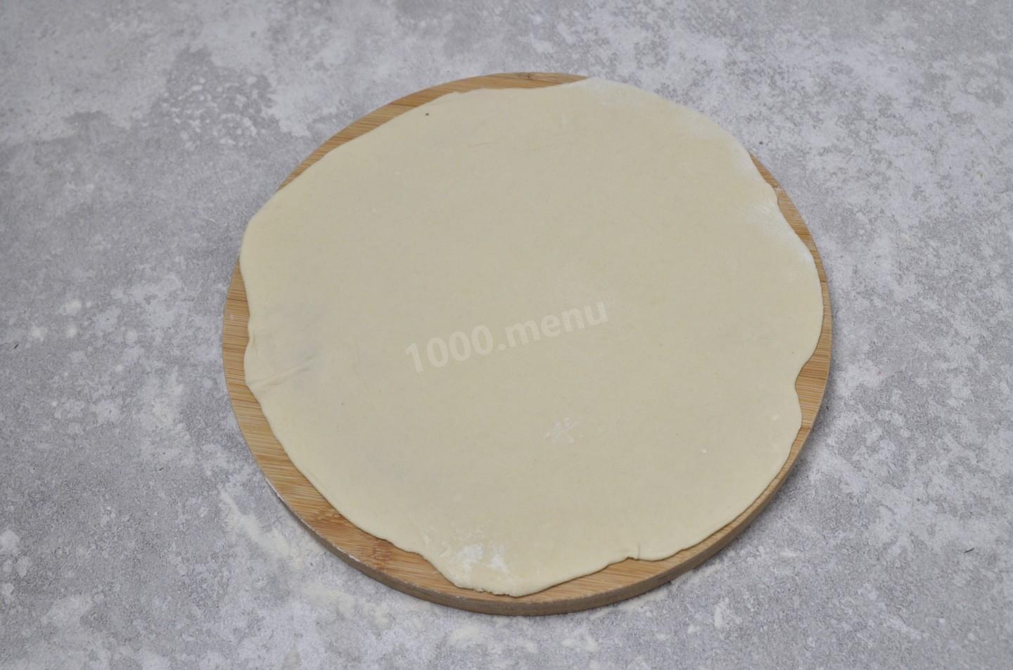 Вылежавшееся тесто разделите на 4 части. Каждую раскатайте в тонкий круглый пласт. Мне удобнее было это делать на круглой доске, чтобы сразу видеть границы раскатки.
