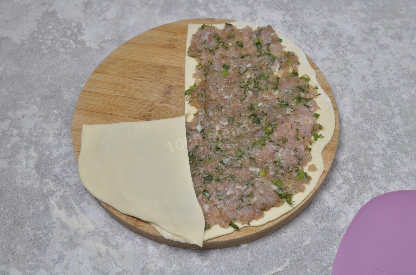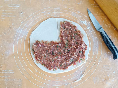 Выложите на тесто фарш и размажьте его тонким слоем, оставив одну четвертую часть свободной. Сделайте вдоль нее надрез от центра к краю.