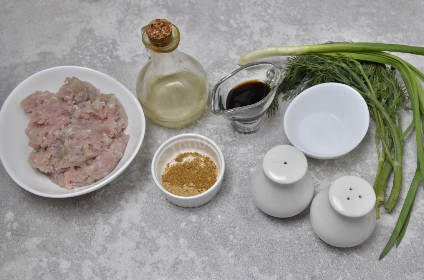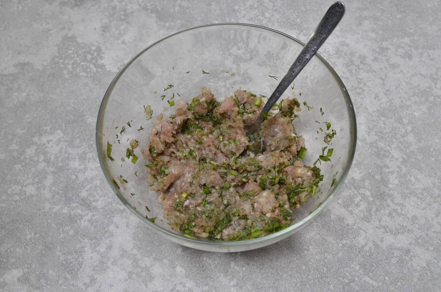 Пока тесто отдыхает, подготовьте начинку. Фарш можете взять любой, у меня свинина-говядина, подойдет и куриный, и из индейки. Набор и количество специй регулируйте по своему вкусу. Кроме лука и укропа вы можете добавить и любую другую зелень.