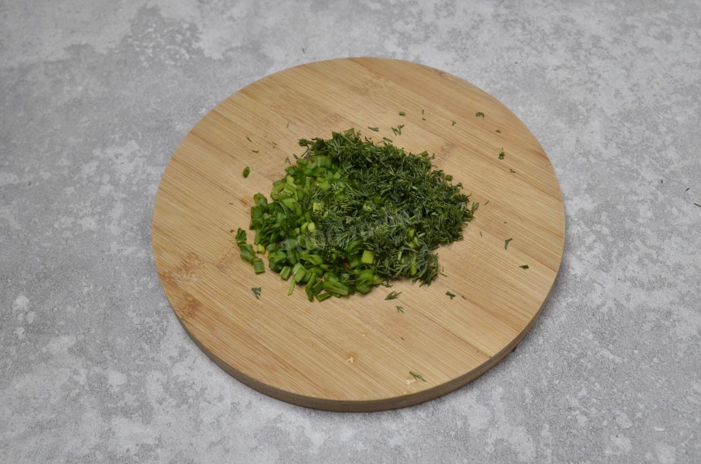 Зелень помойте и хорошо обсушите. Мелко порубите ее ножом.