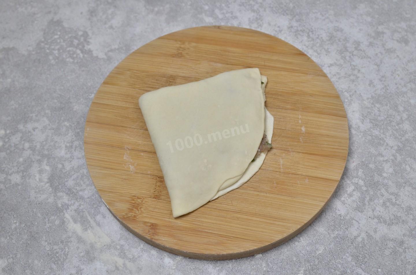 Приготовила тесто по рецепту, оставила "отдыхать". Пока тесто отдыхало, занялась начинкой: смешала все ингредиенты и добавила немного воды, так как смесь показалась мне слишком плотной. Затем разделила тесто — у меня получилось 6 частей. Каждую часть раскатала в круг, выложила начинку, как указано в рецепте, сформировала треугольник и слегка раскатала скалкой.