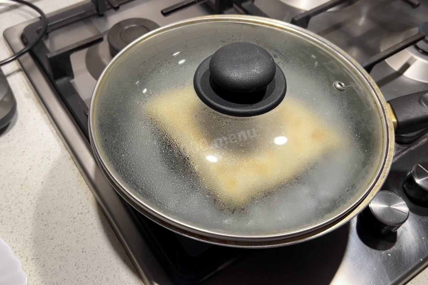 После чего влейте на сковороду немного воды и быстро накройте ее крышкой. Огонь убавьте до минимального. Готовьте лепешку еще минуты 3, до полного выпаривания воды.