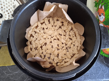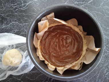 Через полчаса достаньте тесто и разделите его на две неравные части (3/4 и 1/4). Выстелите дно чаши мультиварки двумя полосками пергамента, чтобы пирог было проще доставать. Раскатайте большую часть теста в круг чуть больше диаметра чаши мультиварки и выложите на дно, формируя небольшие бортики.
