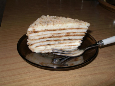 После выпечки коржи складываем друг на друга и промазываем каждый двумя столовыми ложками крема. Это надо делать, пока коржи еще теплые-таким образом крем хорошо впитается в них. Верхний корж не смазываем. Часть крема оставляем. Убираем для пропитки в холодильник на пару часов.