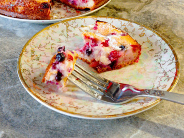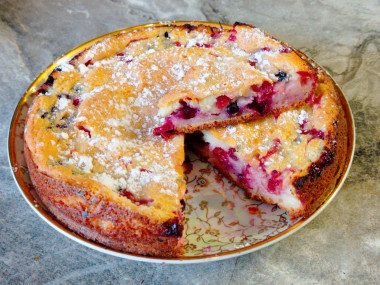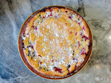 Из этого теста я готовила пирог с красной и чёрной смородиной. В форму диаметром 18 см вылила 2/3 теста, выложила сверху ягоды, посыпала их сахаром и залила оставшимся тестом. Запекала пирог 30 минут при температуре 180 градусов. При подаче сверху посыпала пирог сахарной пудрой.