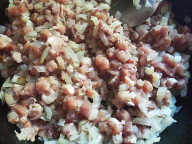 Добавляем к луку фарш и обжариваем до зарумянивания.