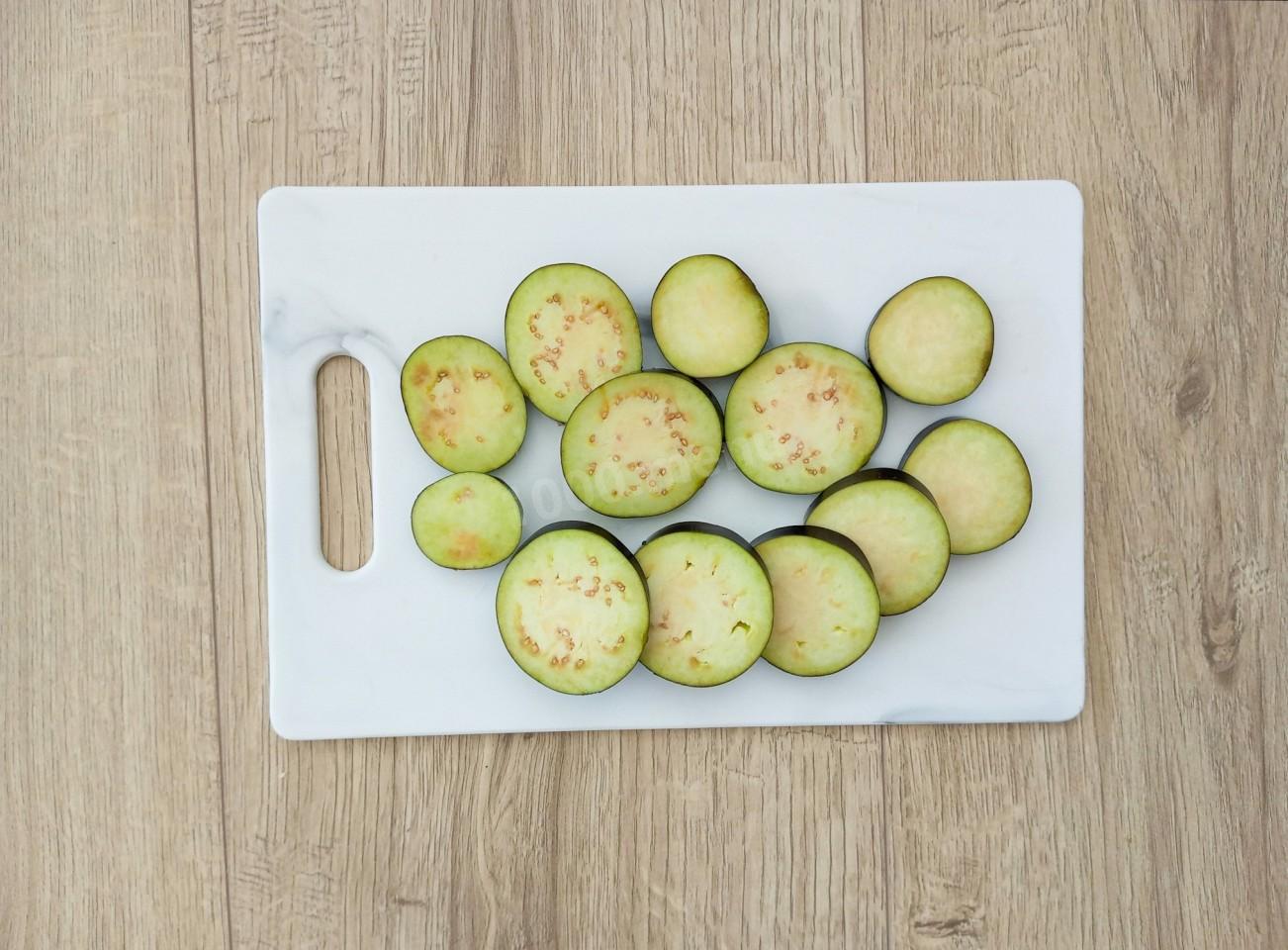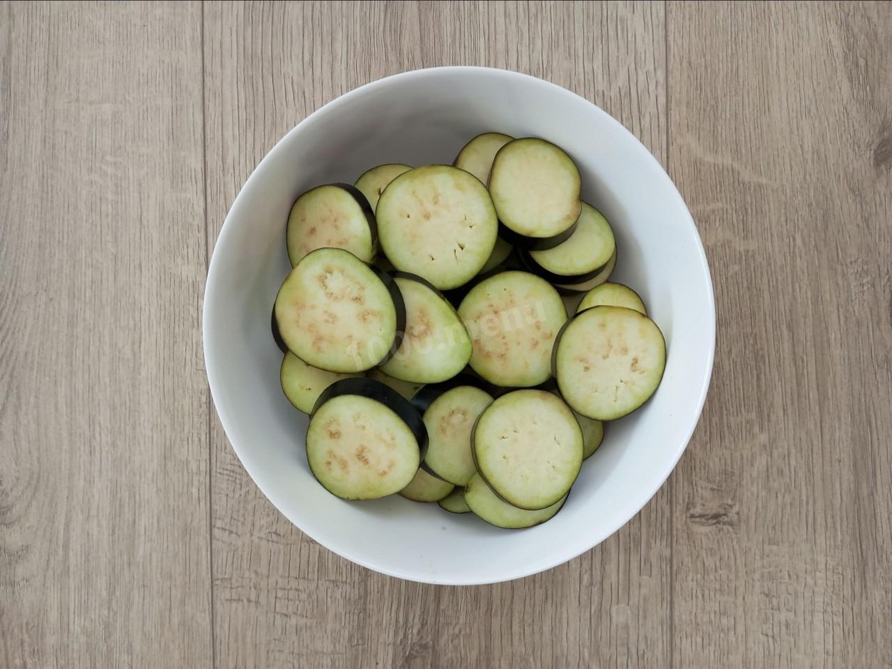 Баклажаны помойте и порежьте кружочками толщиной примерно около 5 мм.