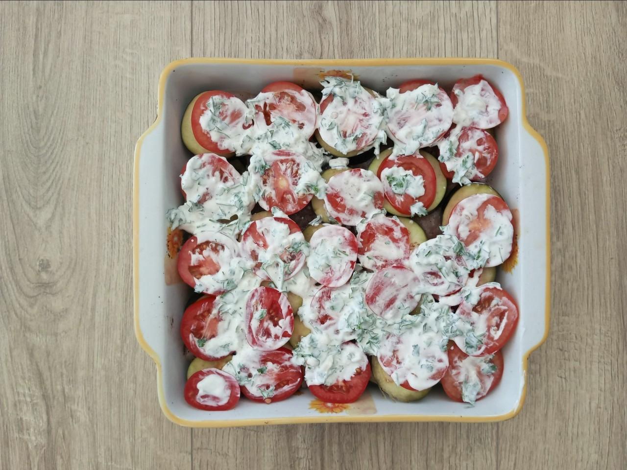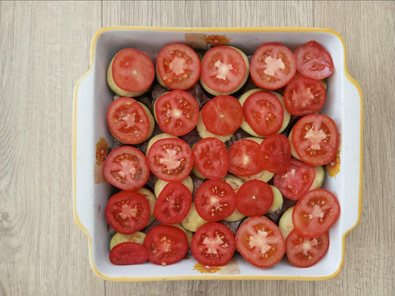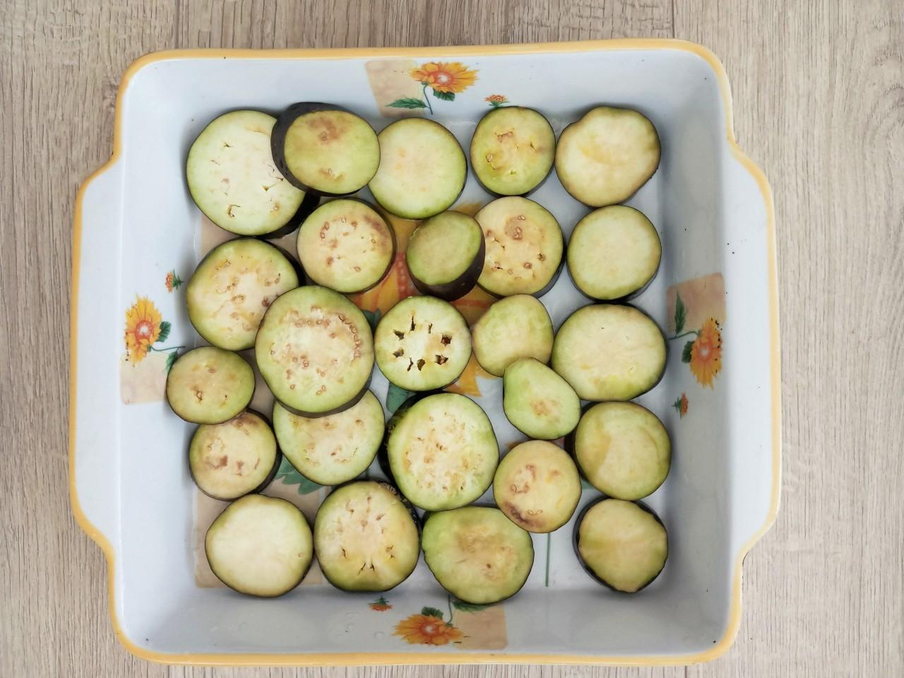 Жаропрочную форму смажьте подсолнечным маслом. Выложите на дно кружочки баклажанов в один слой. О том, как выбрать форму для запекания читайте в статье, ссылка под рецептом.