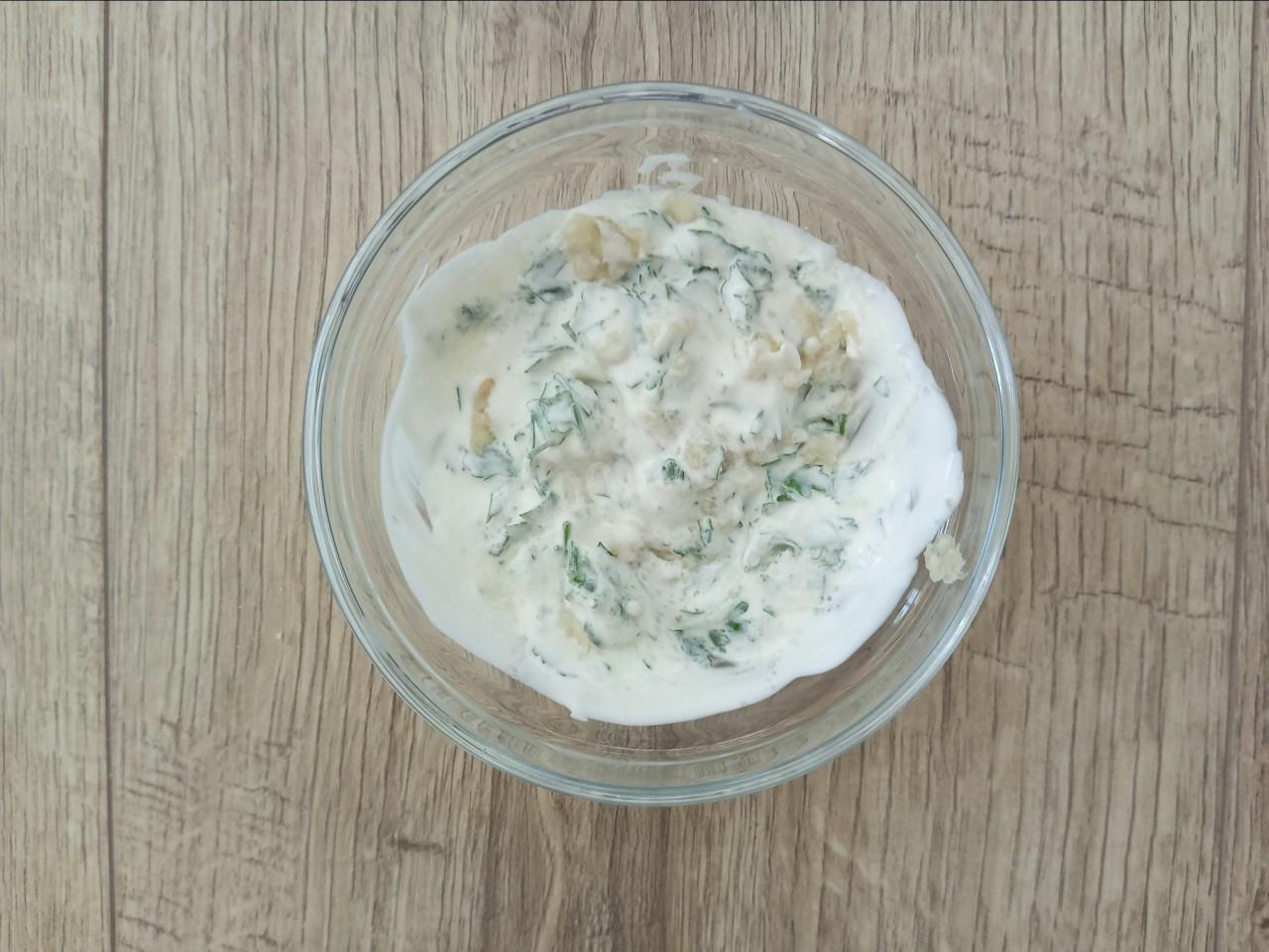 В пиалу со сметаной (или с майонезом) добавьте соль, чёрный перец, чеснок и рубленую зелень. Перемешайте.