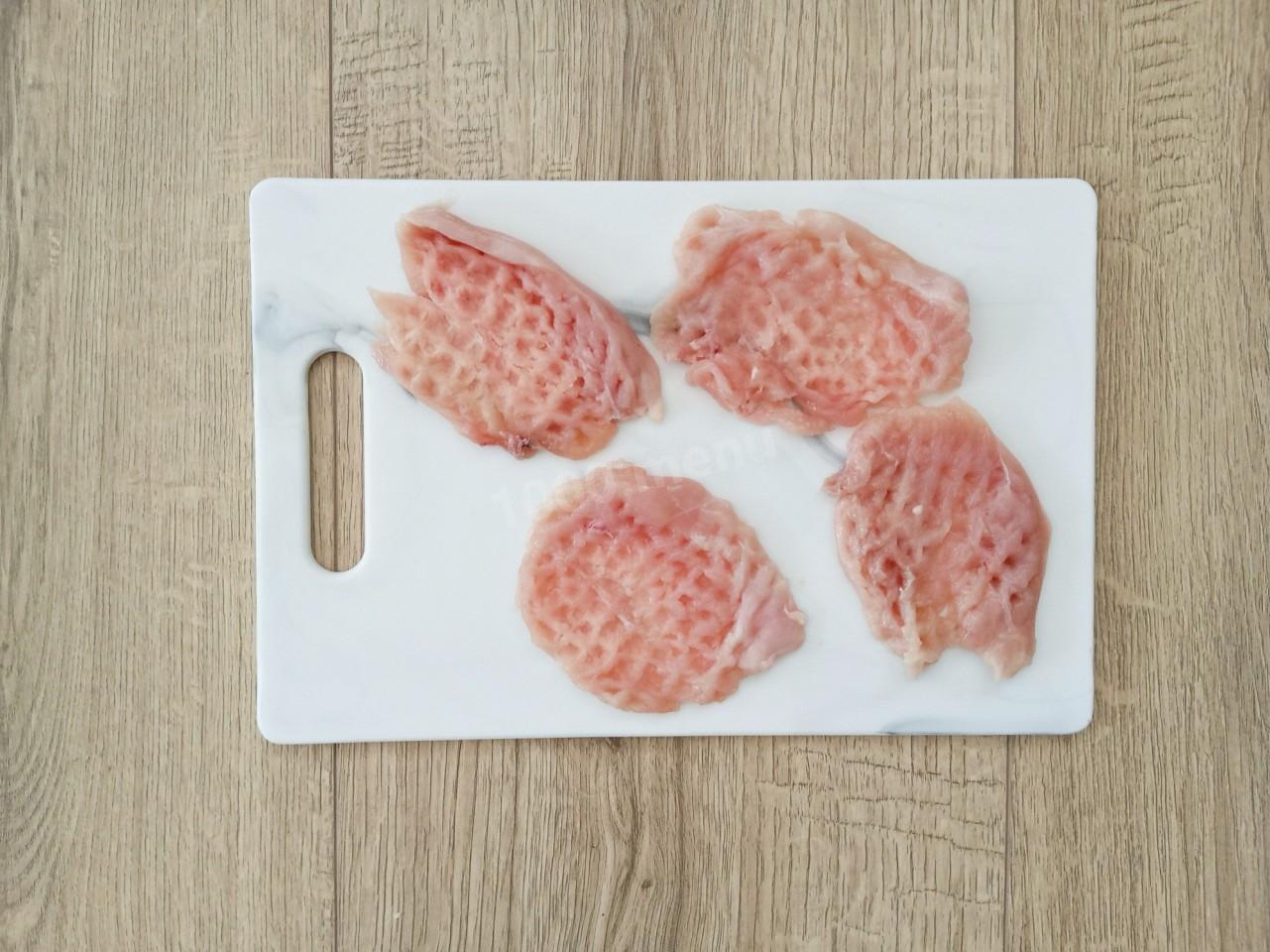 Куриное филе промойте, обсушите бумажными полотенцами. Порежьте филе примерно на 5-6 частей. Каждый кусочек отбейте. Для того, чтобы нежное куриное мясо не распалось на волокна, отбивать его нужно, поместив в полиэтиленовый пакет или накрыв пищевой плёнкой.