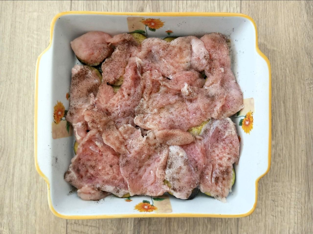 Куриное филе выложите вторым слоем. Поперчите, посолите. Сверху выложите ещё один слой баклажанов.