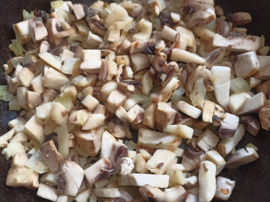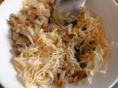 Готовую грибную начинку немного остудите и добавьте к ней твердый сыр, натертый на терке.