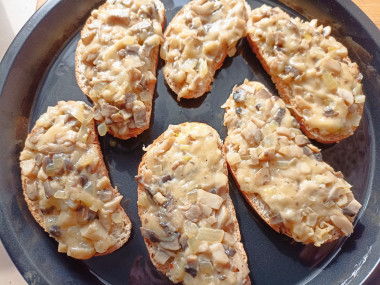 Для перекуса выбрала рецепт горячих бутербродов с грибами и сыром в духовке. Батон взяла отрубной, бекон не использовала, просто обжарила лук и грибы на растительном масле ( соль и черный перец добавила по вкусу), затем перемешала готовую начинку с натёртым сыром, выложила ее на ломтики батона. Запекала бутерброды в аэрогриле при температуре 180 градусов 15 минут ( аэрогриль выручает меня, когда нужно приготовить небольшую порцию блюда). Бутерброды получились очень вкусные, с хрустящими краешками и сочной, аппетитной начинкой. При подаче на каждый ломтик положила по дольке свежего помидора- стало ещё сочнее и вкуснее. Рецепт понравился, рекомендую попробовать. Спасибо, Юлия М!