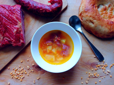 Гороховый суп с копченостями в мультиварке получился отличный. Из копченостей добавила свиные ребрышки и краковскую колбасу. Варила суп на 1 литре воды (больше в чаше моей мультиварке не умещается).