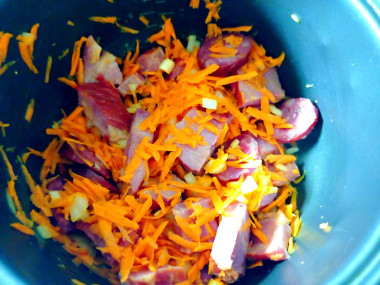 Добавьте к мясу измельченные лук и морковь, одну ч.л. растительного масла и обжарьте до золотистого цвета.