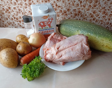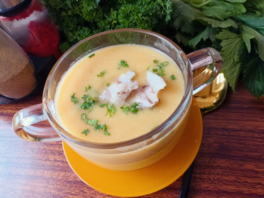 Приготовила овощной крем -суп со сливками. Сварила куриный бульон, затем кусочки курицы извлекла из бульона, а нарезанные кусочками овощи опустила в готовый бульон и варила всё вместе до мягкости ( к указанным в рецепте овощам дополнительно добавила кусочек тыквы) . Блендер у меня с металлическим корпусом, поэтому суп я не охлаждала, сразу измельчила до состояния пюре, добавила сливки ( 20% ), довела до кипения. При подаче в крем-суп порционно положила куриное мясо ,