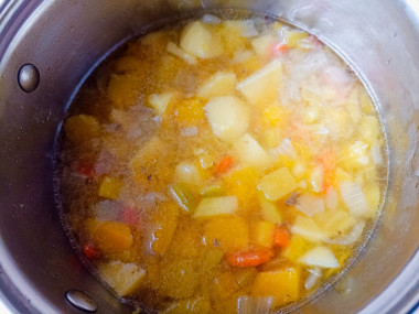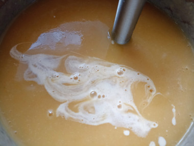 Добавляем зелень. Даем минутку прокипеть. И выключаем. Теперь нужно немного суп охладить (примерно до 80 градусов, чтобы не блендер) и с помощью блендера пюрировать его.