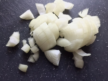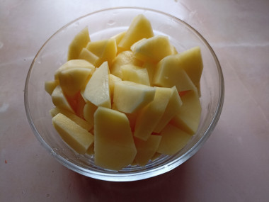 Картофель почистить, нарезать кубиками и добавить к мясу.