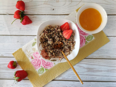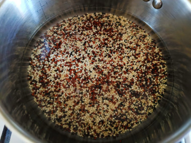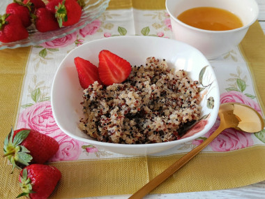 Приготовила на завтрак новую для нашей семьи - кашу из киноа на воде. Решила ничего не добавлять, ни молока, ни сахара, чтобы "познакомиться" с новым продуктом. Я использовала трехцветное киноа, черные зерна чуть плотнее, белые самые мягкие. Получилась рассыпчатая каша с необычным вкусом. Мне показалось что-то среднее между рисом и пшеничной кашей. Благодаря нейтральному вкусу кашу можно есть и подслащеную медом или фруктами. Или есть вместе с мясом в качестве гарнира. Даже без добавок это очень питательный продукт, богатый белком и клетчаткой. Ведь в 100 гр киноа содержится 15 гр белка. Не зря его называют "суперфуд". Способ приготовления прост и понятен, то что нужно для быстрого и полезного завтрака. Спасибо за рецепт!