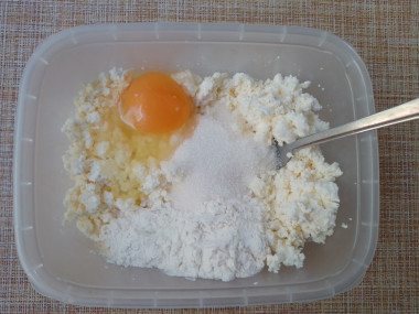 Творог разомните вилкой, добавьте манку, перемешайте, оставьте на 10-15 минут.
