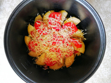 Лук, баклажан, помидорку и сыр выкладывала в чашу мультиварки слоями, повторила слои два раза.