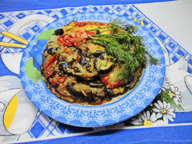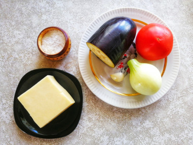 Подготовьте необходимые продукты. Овощи помойте под проточной водой, обсушите. Очистите лук от шелухи и нашинкуйте полукольцами, баклажаны нарежьте кружками толщиной около сантиметра, а помидоры - тонкими кругляшками. Чеснок очистите и пропустите через пресс. Сыр натрите на крупной терке. Используйте остатки разных сыров из морозилки - они придадут блюду интересный вкус.