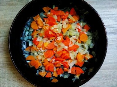 Лук с морковкой закладываю одновременно с консервами. Тогда же и перец с лаврушкой. Варим минут пять. Пробуем, если нужно, досаливаем.