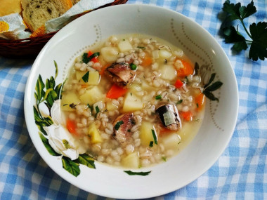 Суп из рыбных консервов я ела только в походных условиях, и даже в голову не приходило мне готовить его дома. А это, оказалось, очень экономит время! И суп получается очень сытным и вкусным! Перловку я замочила в холодной воде на ночь. От моей перловки обычно супы получаются мутными и сероватыми, поэтому для яркости и аппетитного вида готового блюда я покрупнее порезала морковь, а под конец варки добавила порубленной свежей зелени. Вкусный суп из рыбных консервов с перловкой вышел, спасибо за рецепт!
