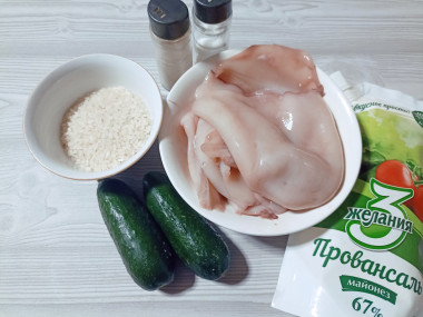 Как сделать салат с кальмарами, рисом и огурцом? Для начала подготовьте необходимые ингредиенты по списку. Рецепты домашнего майонеза вы найдёте после последнего шага. По желанию можете добавить в салат другие ингредиенты по вкусу: болгарский перец, оливки и т. д. Кальмары можете дополнить другими морепродуктами: мидиями, креветками и т. д.