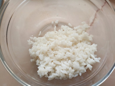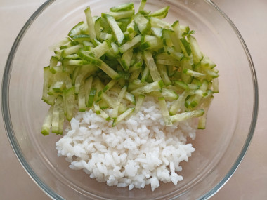 Рис предварительно отварите в подсоленной воде, откиньте на дуршлаг и охладите. Рис должен получиться рассыпчатым, не клейким. Если вы хотите правильно подобрать рис для салата, рекомендую прочитать статью о тонкостях выбора риса. Ссылка есть в конце рецепта.
