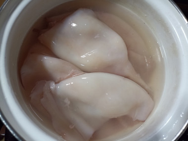 Кальмары очистите от шкурки, внутренних пленок, удалите хитиновую пластину и внутренности. Хорошенько промойте. Если кальмары замороженные, предварительно их разморозьте, но не до конца - подмороженные кальмары очищать легче. Отварите кальмары в подсоленной кипящей воде 1-2 минуты, не дольше, иначе они станут резиновыми и невкусными. Если у вас кальмары неочищенные, возьмите их с запасом, ведь после очистки чистый вес морепродуктов уменьшится.
