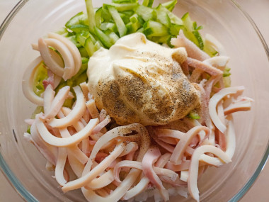В миске соедините кальмары, огурцы и рис. Салат заправьте майонезом, приправьте солью и перцем по вкусу и перемешайте.