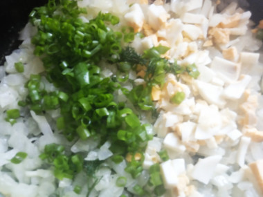 Тем временем займемся начинкой. Яйца сварите вкрутую и залейте холодной водой для остужения. Очистите от скорлупы и нарежьте кубиком. Лук очистите, нарежьте тонкими полукольцами и припустите на сковороде в разогретом масле до легкой золотистости (не зажаривайте!) Остудите. Зелень вымойте в проточной воде, обсушите и мелко порубите.