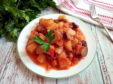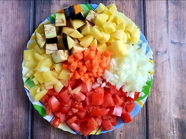 Баклажаны сначала посыпала солью, чтобы избавиться от горечи, а через 15 минут промыла их. К набору овощей добавила морковь, нарезанную кубиками. Помидорки взяла спелые, сладкие, шкурку можно снять, но я оставляю. Лук обжарила и стала последовательно добавлять овощи. В конце положила в казанок ложку томатной пасты. Жидкости от овощей хватило, чтобы получился очень вкусный соус! Да и само рагу получилось вкусным и сочным! Дочке понравилось и остальным домочадцам тоже).