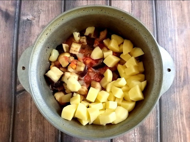 Дочка захотела попробовать тушеные баклажаны с картошкой. Конечно я приготовила это блюдо. Тушила овощи в небольшом казанке.