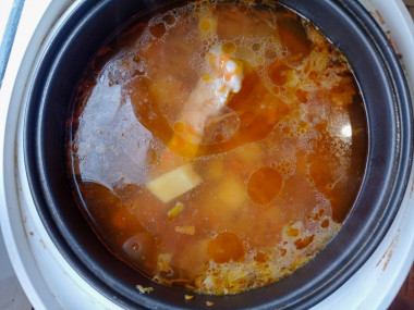 Решила приготовить на обед суп, основываясь на рецепт супа с ребрышками в мультиварке. Делается он очень просто и практически не требует активного участия в приготовлении. У меня была заморожена свиная косточка с небольшим количеством мяса, на ней и варила суп. Вместо помидора добавила в суп столовую ложку томатной пасты.