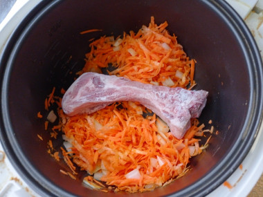 Морковь почистить и натереть, лук мелко покрошить, сложить в чашу мультиварки включить режим "Жарка" обжарить на протяжении 5-8 минут на растительном масле.