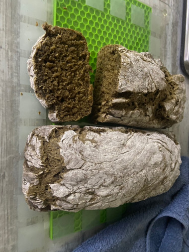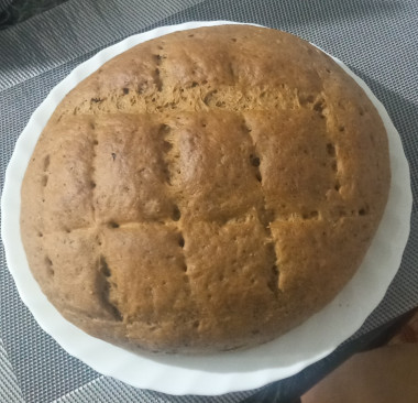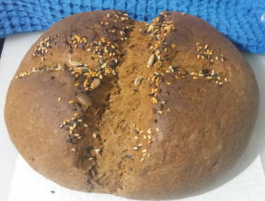 Спасибо автору за хороший рецепт и подсказку, как заменить солод, если вы не нашли его в продаже. Мой хлебушек вышел ароматный, с хрустящей корочкой, с особенным вкусом благодаря солоду. По совету автора я взяла половину порции, чтобы вышла одна буханка. При замесе у меня ушло немного больше муки, нежели указано в рецепте, так как тесто очень липло. Солод я получила, использовав сухую смесь для приготовления кваса - одна купленная упаковка как раз оказалась дома. Верх хлебушка, когда он был ещё тестом и всходил в последний раз перед выпечкой, я посыпала высевками, которые остались после просева ржаной муки. Плюс домашнего хлеба - он долго сохраняет свежесть и вкусовые качества нежели магазинный. Потому у нас дома - только домашний!