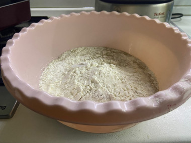 Замесите тесто, добавляя понемножку теплую воду. Сначала удобно месить ложкой, а затем в дело вступят руки или миксер. Всего у меня ушло около 400мл воды. У вас может уйти как больше, так и меньше