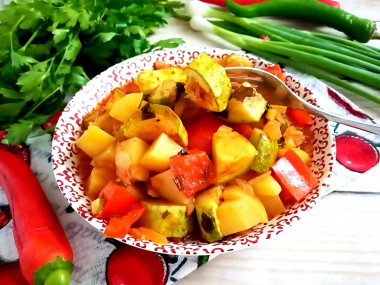 Как сделать соус с кабачками и картошкой? Подготовьте все продукты, которые указаны в списке. Если вы возьмёте болгарские перцы разных цветов, тогда готовое блюдо получится невероятно ярким и аппетитным.