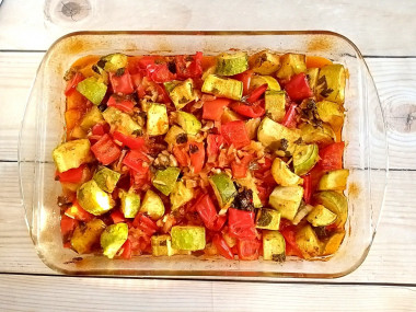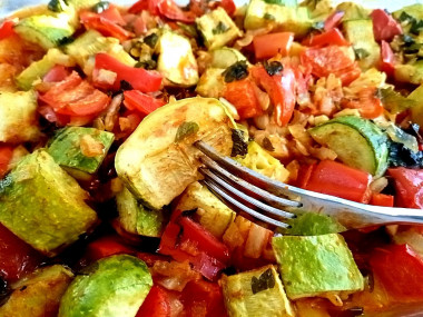 Кабачки я нарезала крупнее, чем остальные овощи. Так они лучше сохраняют форму и немного хрустят. Из специй я выбрала паприку и приправу для картофеля.