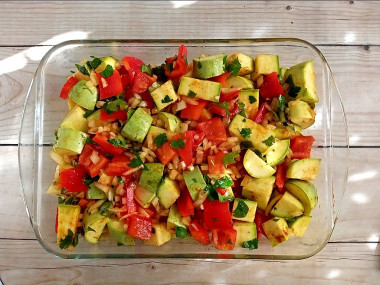 Все овощи отправьте в глубокую ёмкость. Посолите и поперчите по вкусу. Добавьте любимые специи, хорошо подойдёт сухой базилик, прованские травы, копчённая паприка и т.д. Всё тщательно перемешайте.
